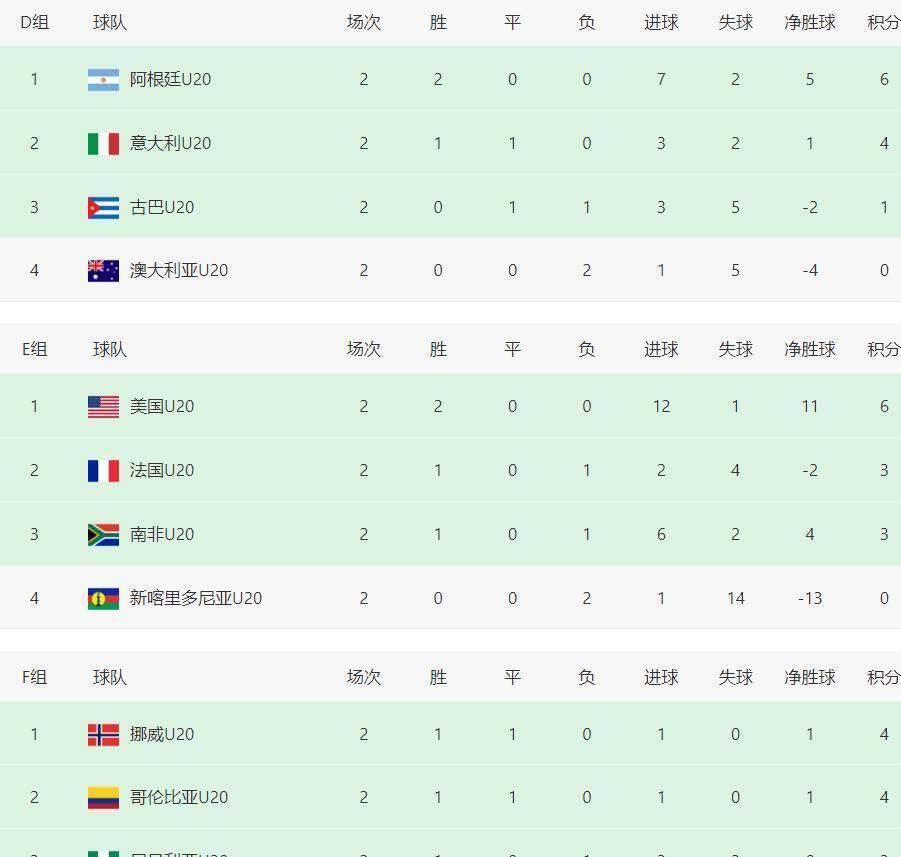 U20亚洲杯冠军澳大利亚更惨。 首轮0-1输给意大利还算惜败,第二轮直接被阿根廷灌了个1-4。 亚军沙特也一样,先被哥伦比亚1-0闷棍,再让尼日利亚3-2逆转,两场丢4球,防守形同虚设。 这俩难兄难弟双双两连败0分垫底,最后一轮基本就是走个过场了。