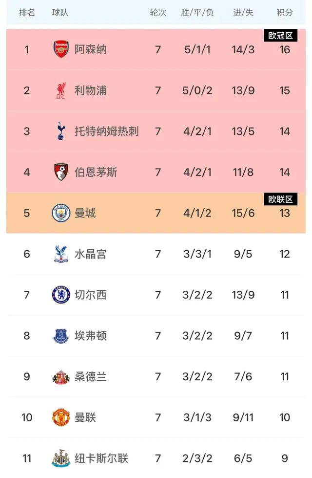 截至目前,利物浦以5胜2负的成绩排在第二位,落后榜首阿森纳1分;曼联以3胜1平3负的成绩位居第10名,落后前四4分。