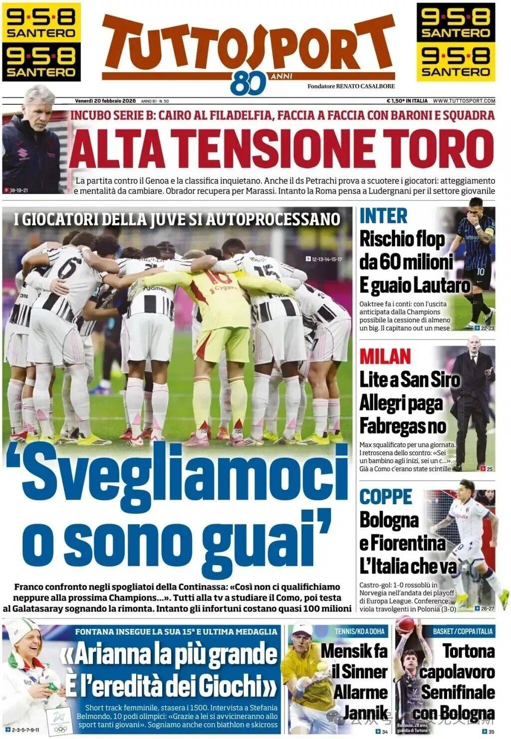 1. 尤文图斯球员们在更衣室里进行了坦诚的沟通,他们意识到:“我们必须清醒过来,否则后果将不堪设想。”大家都在关注着科莫的比赛,同时也梦想着在与加拉塔萨雷的次回合比赛中实现逆转。然而,球队的伤病损失已经超过了1亿欧元。