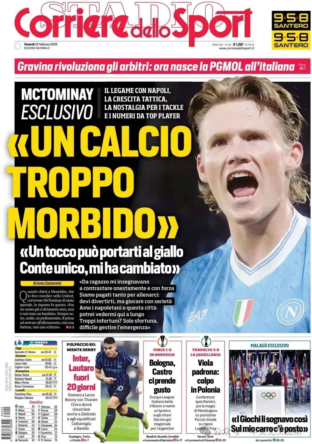 1. 独家专访麦克托米奈:“足球太软了。”他谈到了与那不勒斯的传闻、战术上的成长、对铲球的怀念,以及自己配得上顶级球员的数据。“现在一次触碰就可能被出示黄牌。孔蒂是独一无二的,他改变了我。小时候,我被教导要进行真正的铲球,要有力。我们训练付出了很多,你必须享受比赛,并且认真对待。我喜欢那不勒斯这座城市,我在这里看到了自己未来的可能性。伤病太多?只是运气不好,很难应对的紧急情况。”