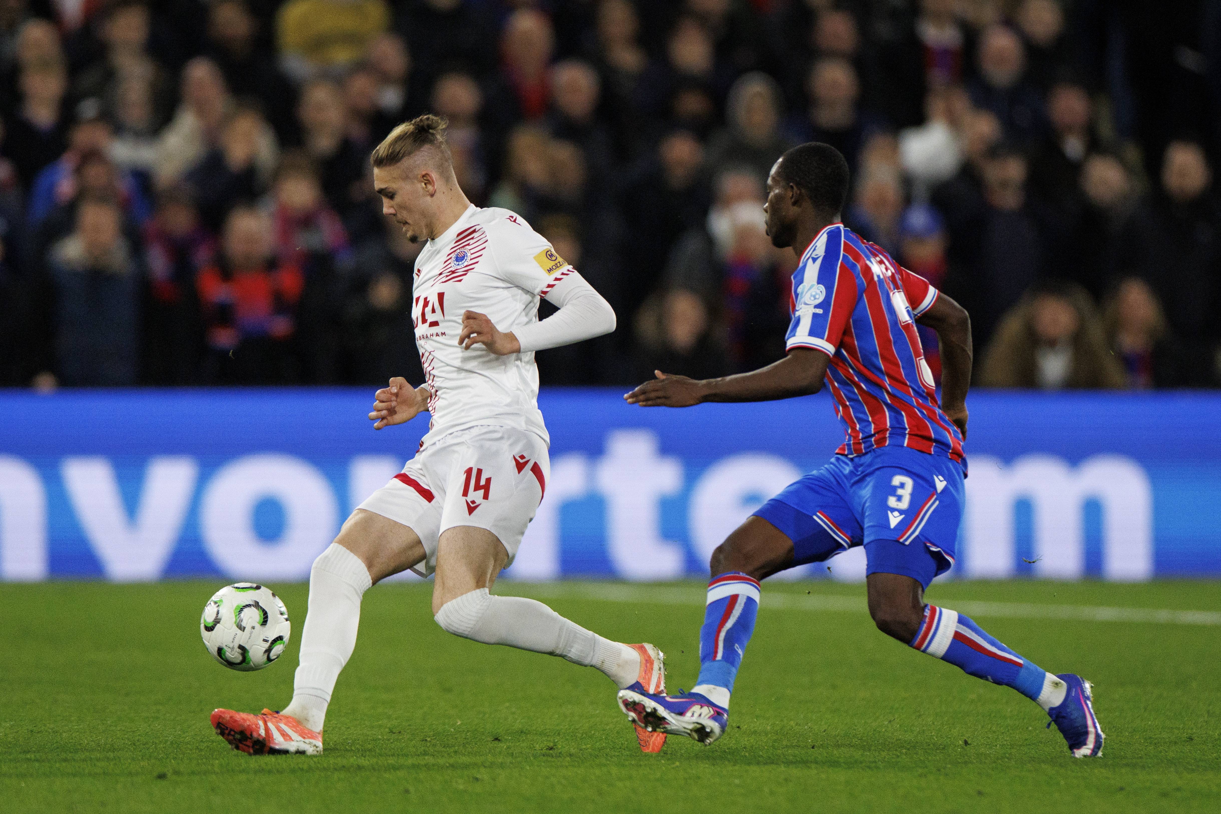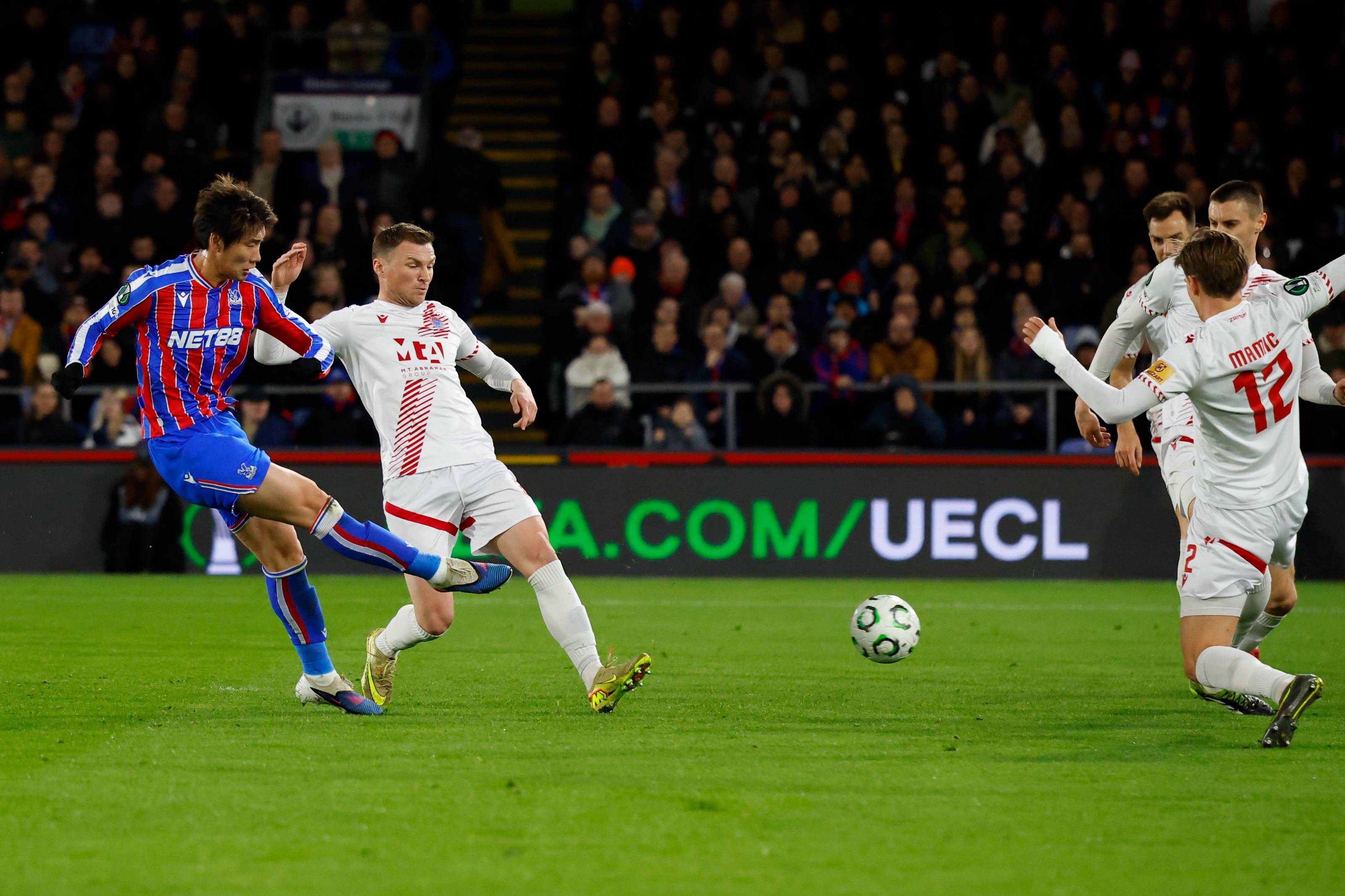 2月26日,水晶宫队球员镰田大地(左)与莫斯塔尔日林斯基队球员萨维奇拼抢。 新华社/欧新