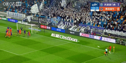 第77分钟,海牛后卫解围失误,谢蒂内打门折射入网,津门虎1-0领先海牛!