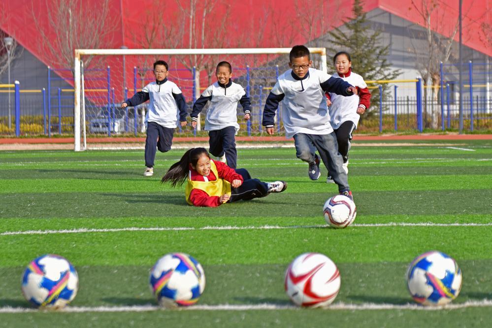 在山东省烟台市福山区芝阳山学校,学生进行足球基本功训练。 新华社发(孙文潭摄)